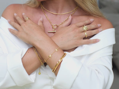 Close-up of a woman's wrist wearing a gold chain bracelet with an adjustable clasp and circular charm.A woman's crossed arms, wearing a gold chain bracelet, a gold ring, and gold bangles, against a light-colored background.