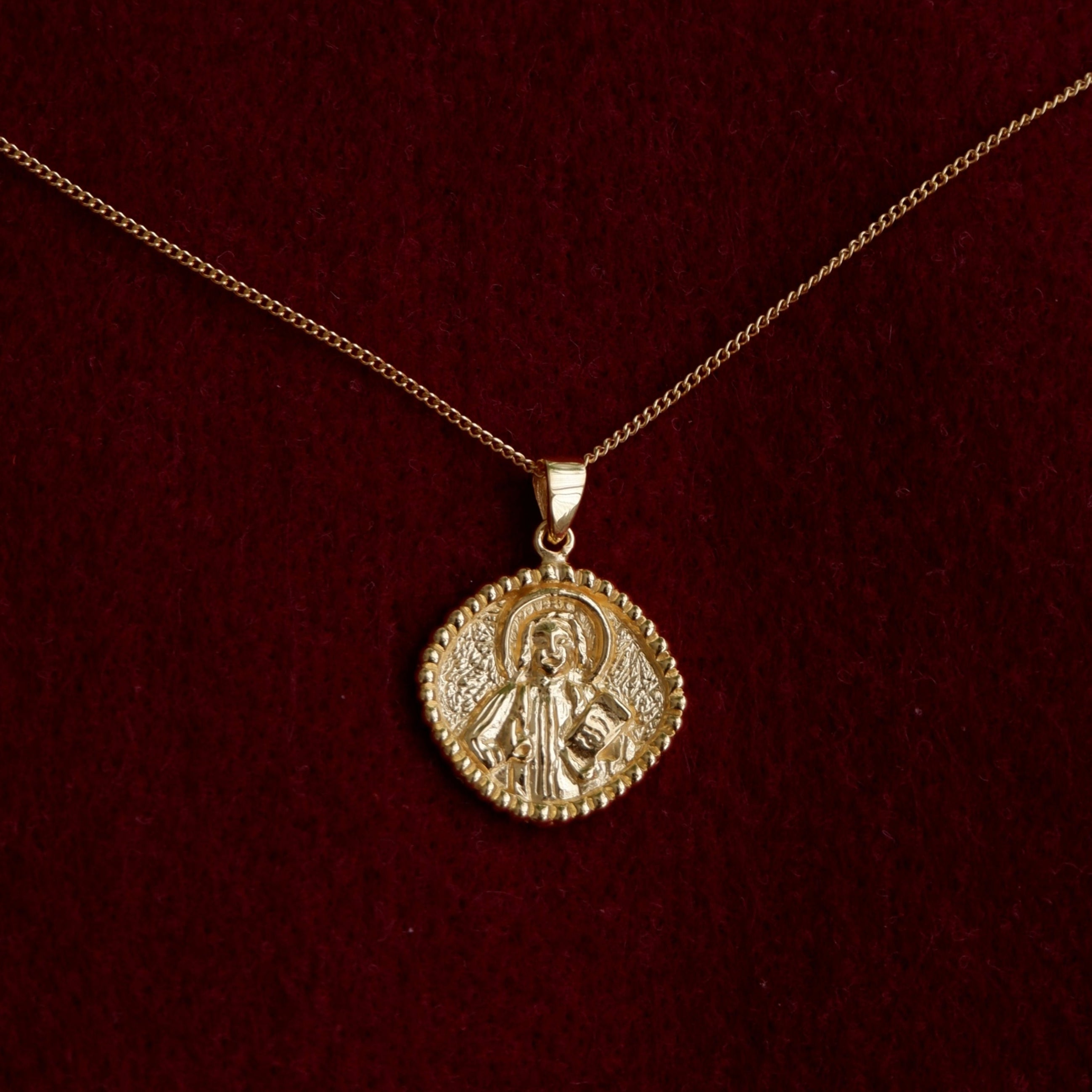 A gold necklace with a round pendant featuring a raised religious figure design, displayed against a white background.