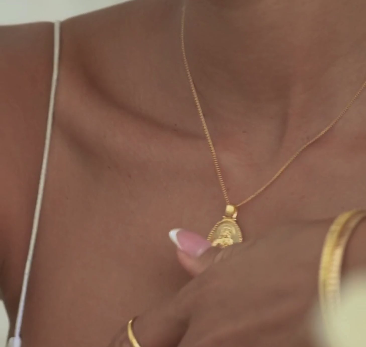 A gold necklace with an arched rectangular pendant featuring a raised religious figure design, displayed against a white background.