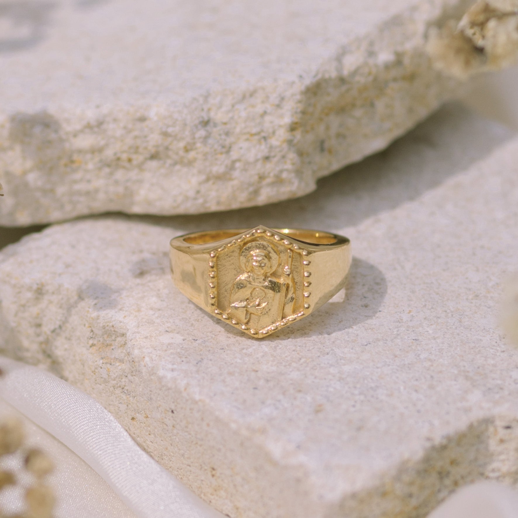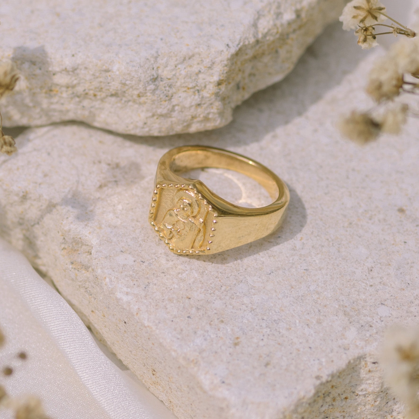 A gold signet ring featuring a raised religious figure design, displayed on a light stone surface with some dried plants in the background.