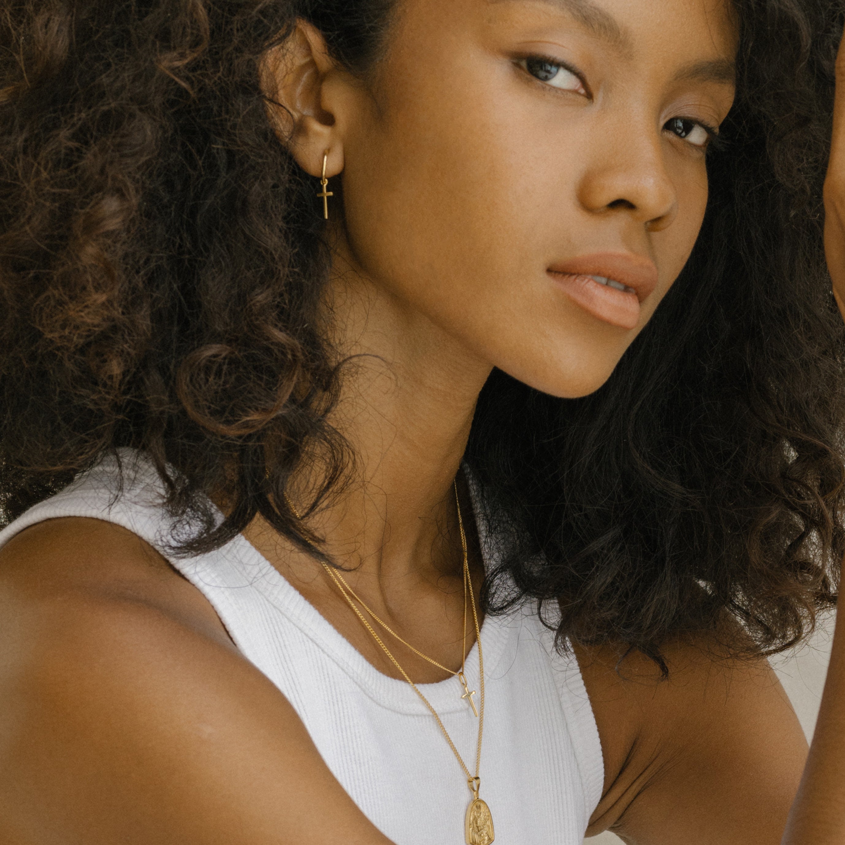 Mini Madonna Cross Charm Hoops - Gold