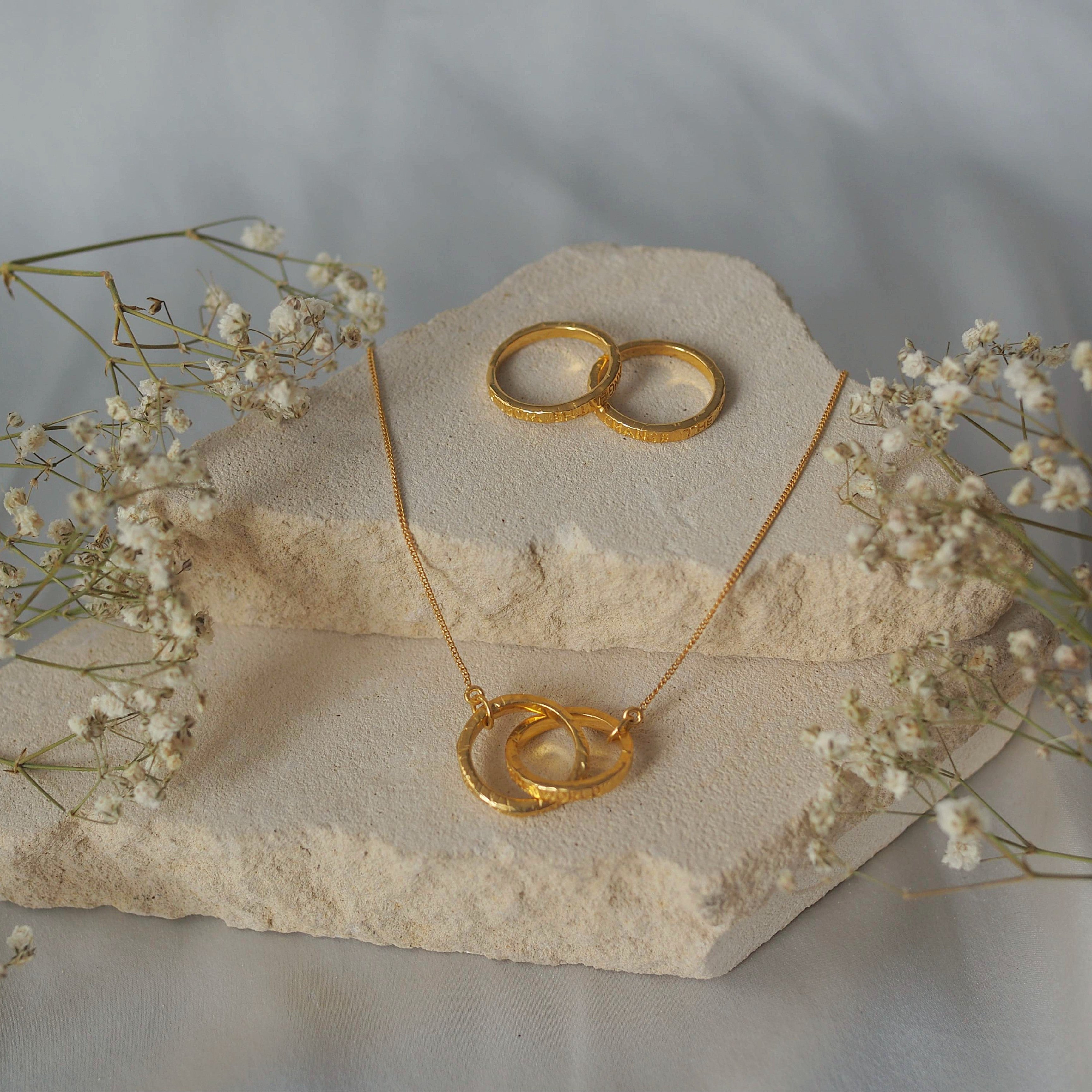 Say hello to our new ‘Support’ necklace with 2 interlinked rings representing the unwavering support we offer one another. These hand-carved rings bear the affirmations "Our Love Can Change the World" and "Love, Earth, Ocean, Happiness”, special words to keep close to your heart during the craze of the days and the wave of life.
